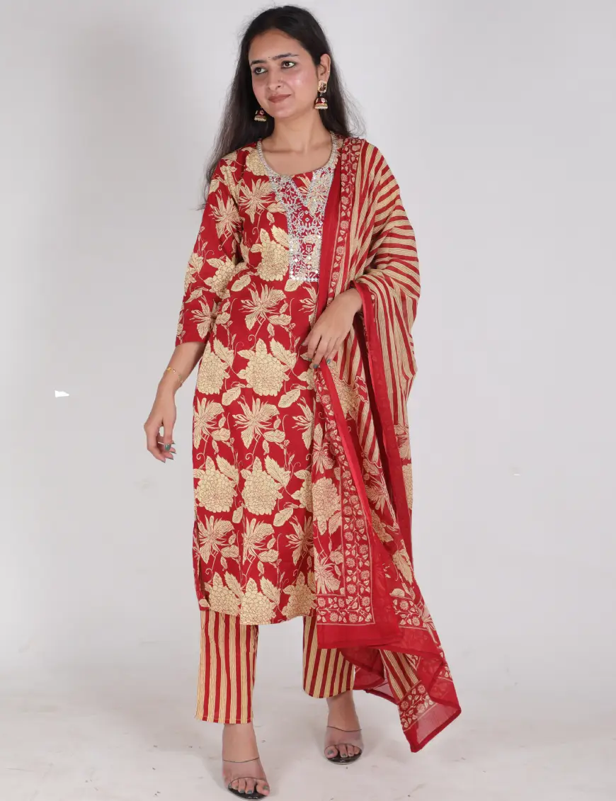 Red Floral Printed Ethnic Suit Set (3-Piece)