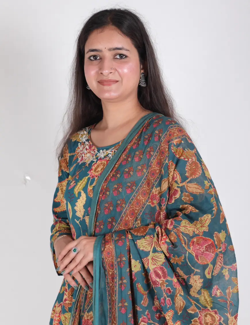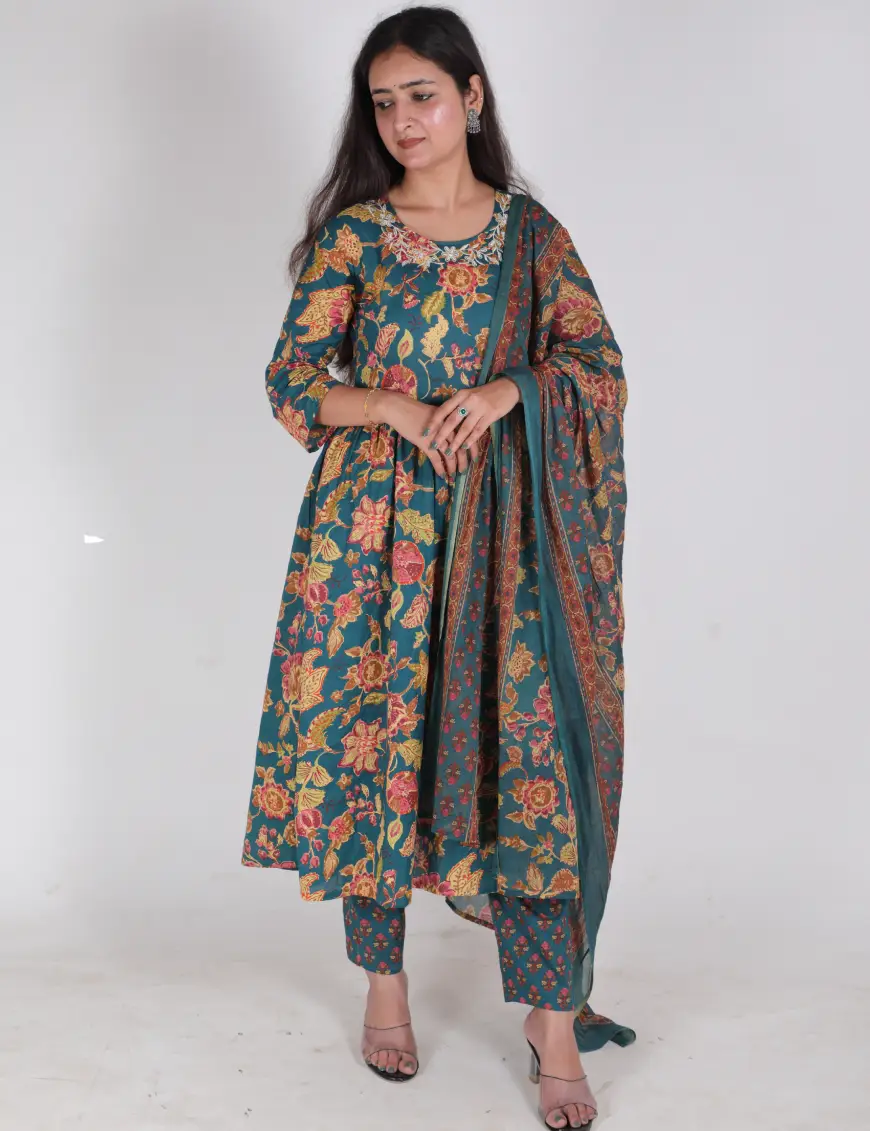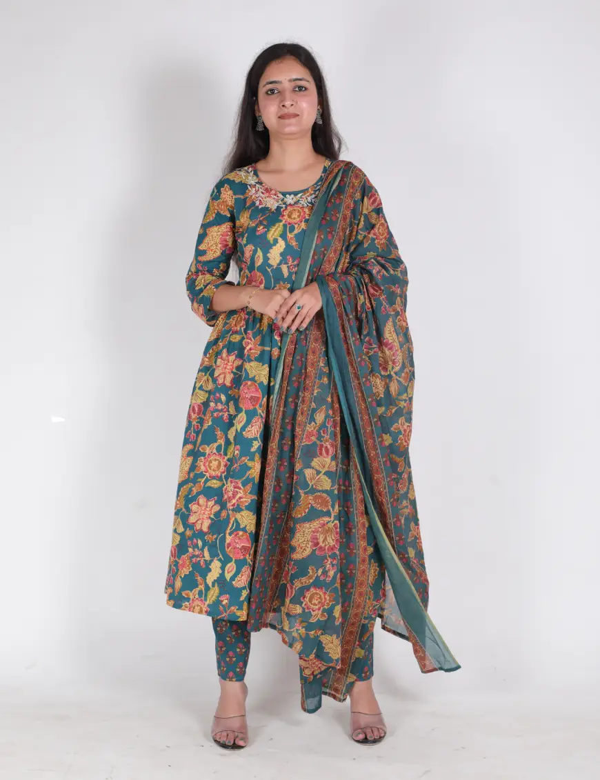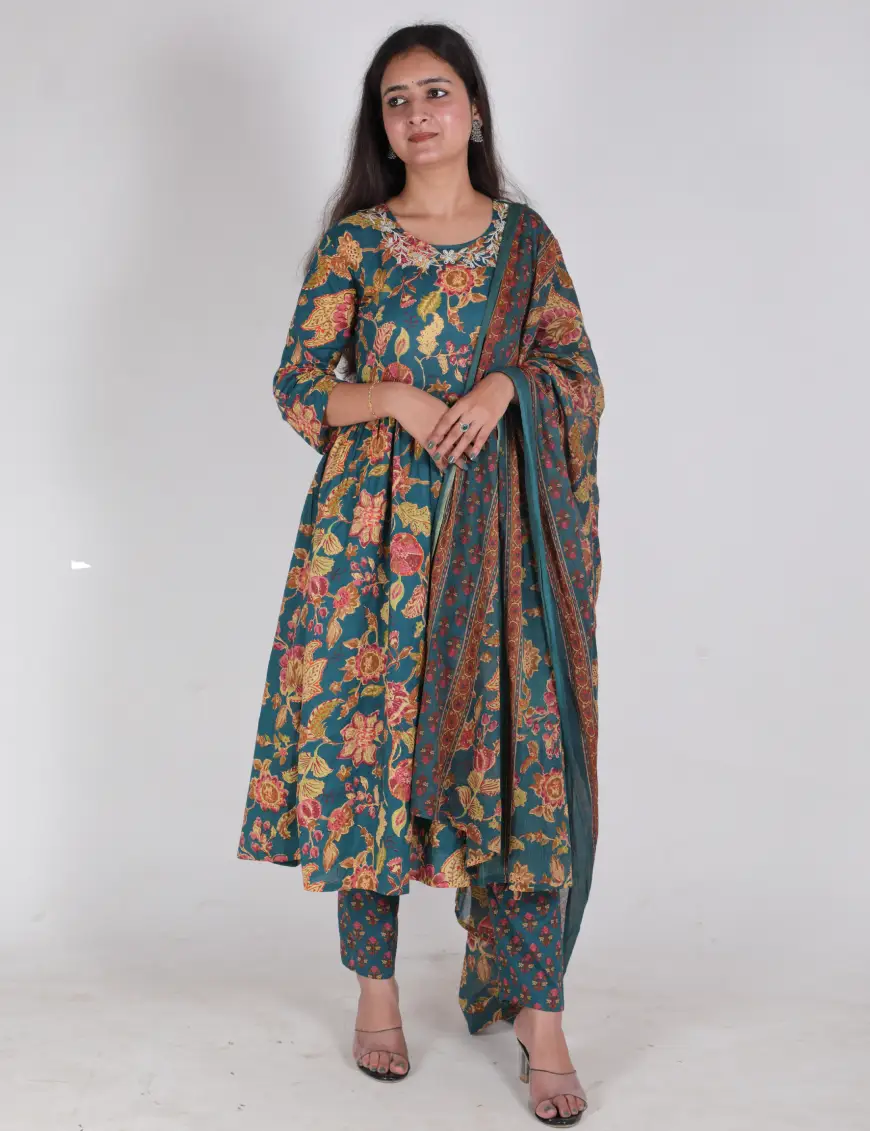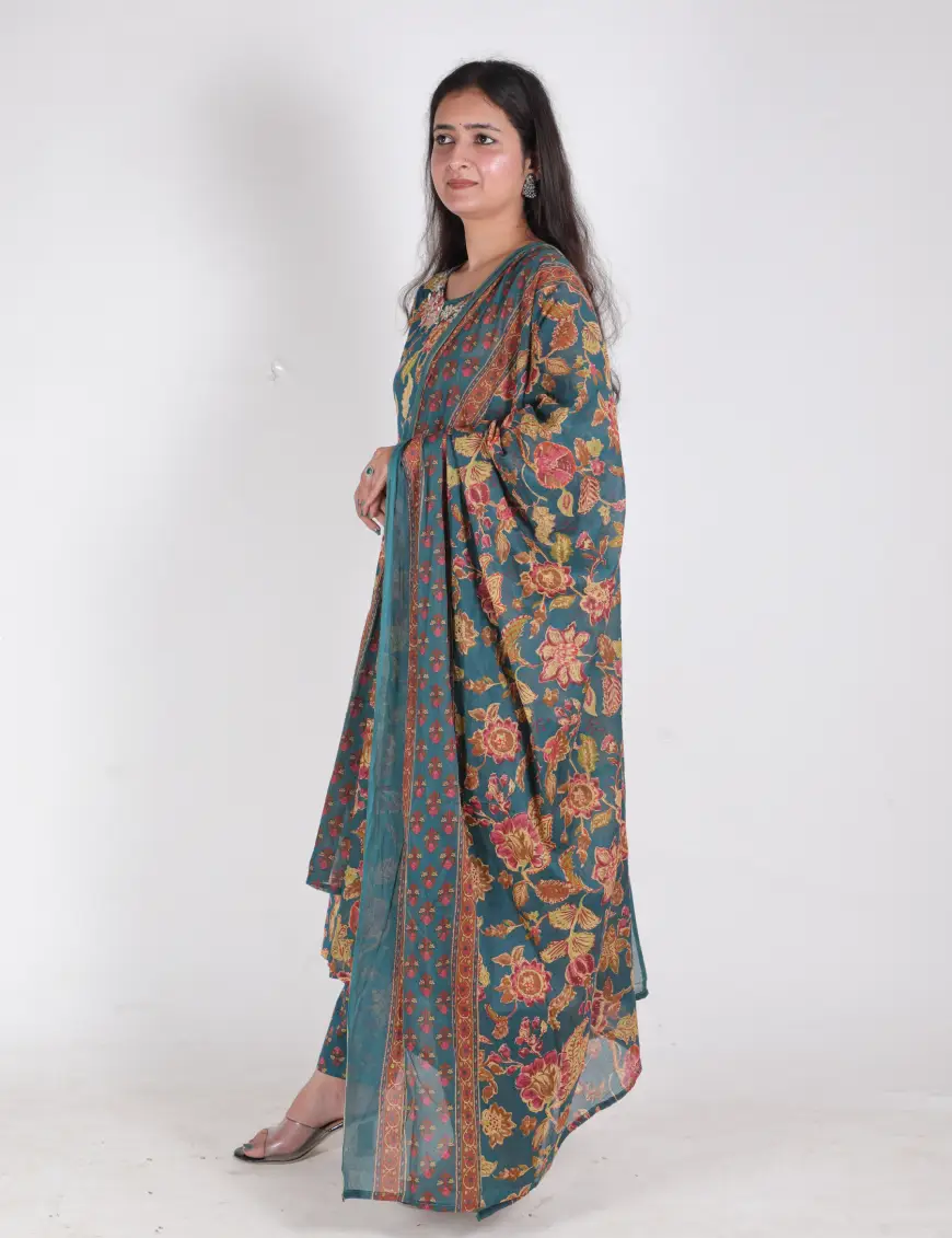 Teal Green Floral Print Suit Set with Matching Printed Dupatta